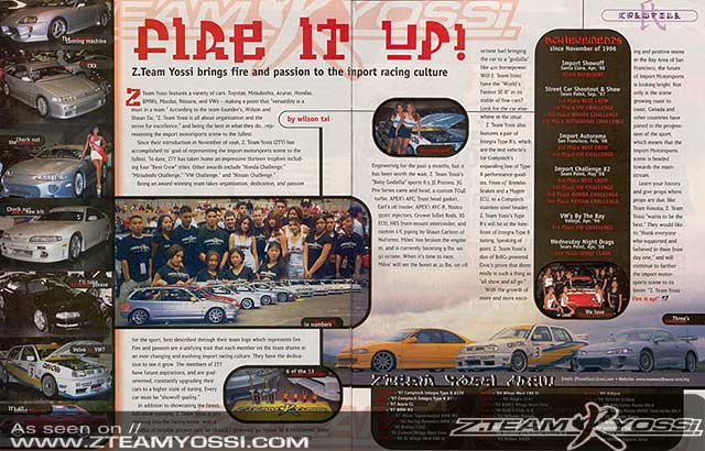 Z.Team Yossi's Team Represent era was three years '97-'00 and ultimately inspired the Fast and the Furious, the film hit movie theaters in 2001. From 1996-2003, ZTYs car culture and its flagships were published globally in newspapers and magazines, such as: Guardian Unlimited UK, Super Street, Super Street 2001 Calendar, Sport Compact Car, Import Racer, Turbo, Import Tuner, Tuning Concept, TMR, Street Racer, Street Legal, Kineda, The Golf UK, Performance VW UK, European Car, MAX Power, MAX Speed, Euro Tuner, Honda Power, Hot Rod Honda, Performance BMW, SXY/Showoff Magazine.